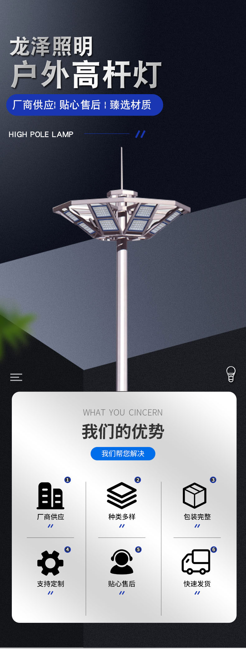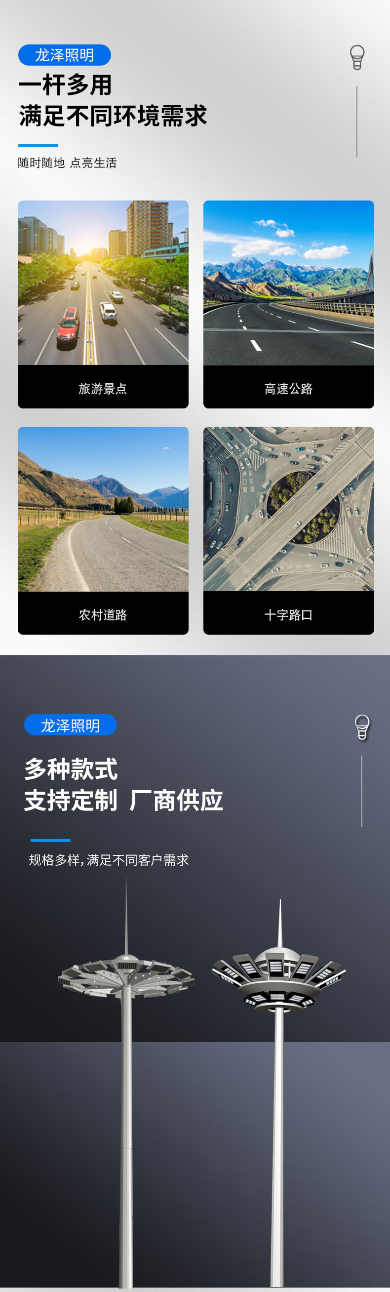 高桿燈桿件選用寶鋼集團優質Q235型號鋼板,經大型號剪板機下料、1200噸大型壓力機成型后焊接、校直、熱鍍鋅、噴塑而成。 可根據用戶需求生產不同長度、不同規格、不同噴塑色彩的市政路燈!